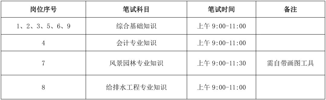 具體各崗位筆試科目及筆試時間見下表: